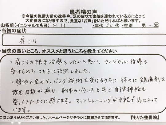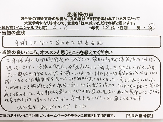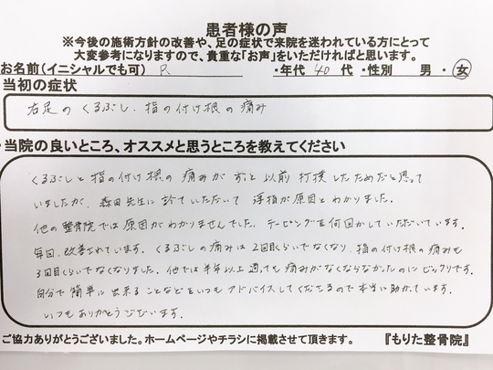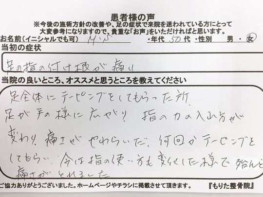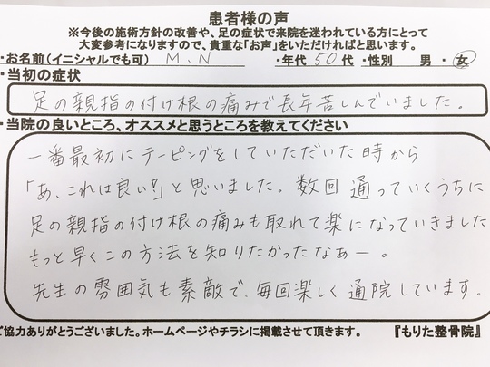 半年前から続いていた、小指の痛みで来院しました。外反母趾もあるし、ちゃんとみてもらいたくて足が専門のこちらにお邪魔しました。最初は痛みがなかなか変化しなかったけど3回目からみるみるうちに痛みが取れていきました。テーピングを巻くこともかぶれないか心配でしたが一度もかぶれることもなく、巻いている方が快適に過ごせました。今は痛みがなくとても嬉しいです。