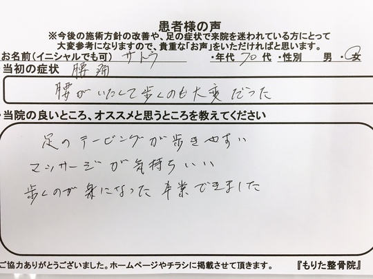 足の施術と、整足テーピングで足の痛み(付け根)が引きました!最初は不安だったけど、通ってみて良かったです!