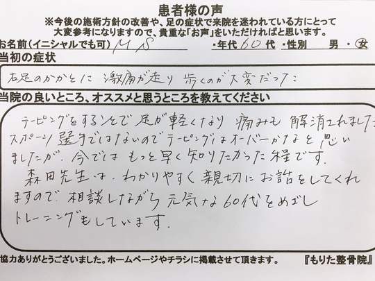 整足テーピングを巻いたら、歩く感じが全然違いました。今は痛みがなくなって本当に良かったです。手術しなくてよかった。
