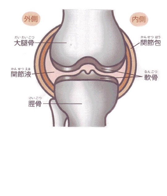 まず、膝関節を簡単に説明します。膝関節は大腿骨(だいたいこつ)という太ももの骨と、脛骨(けいこつ)というすねの骨を関節包という袋で包んでいます。関節包の中には、関節液があり関節液は潤滑油のような役割をしています。また、大腿骨と脛骨の先端には軟骨がありそこが荷重がかかる際のクッションの役割をしているのですが、その軟骨には関節液が栄養を送っています。