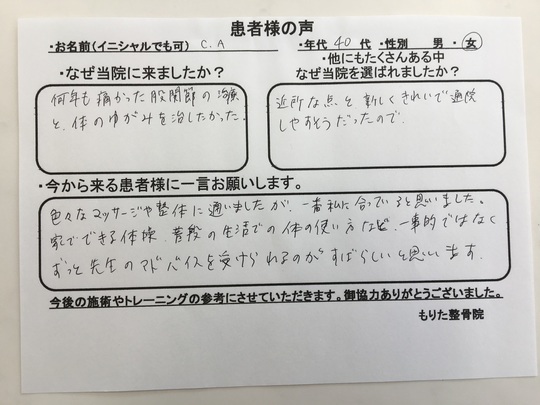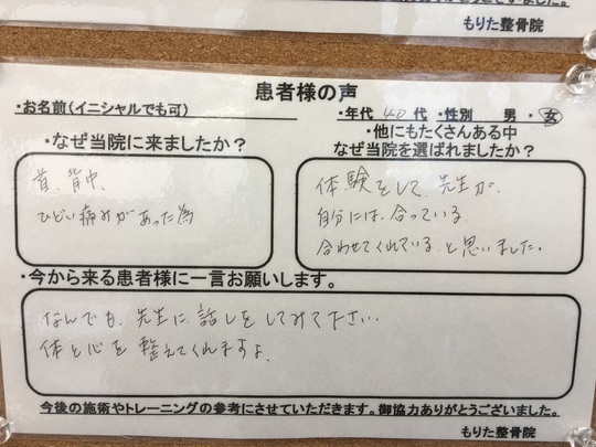色々なマッサージや整体に通いましたが、一番私に合っていると思いました。家でできる体操、普段の生活での身体の使い方など一時的ではなくずっと先生のアドバイスを受けられるのが素晴らしいと思います。