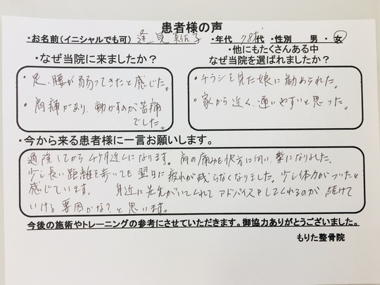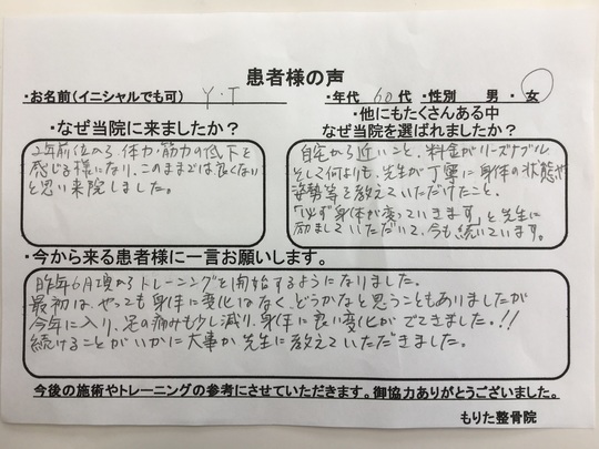 肩の痛みも快方に向かい楽になりました。少し長い距離を歩いても翌日に疲れが残らなくなりました。体力がついたと感じています。身近に先生がいてくれてアドバイスをしてくれるから続けていける要因かなと思います。