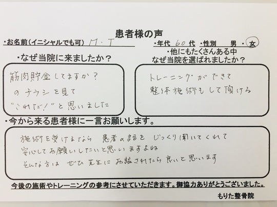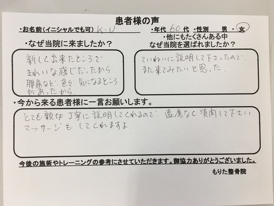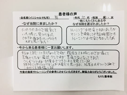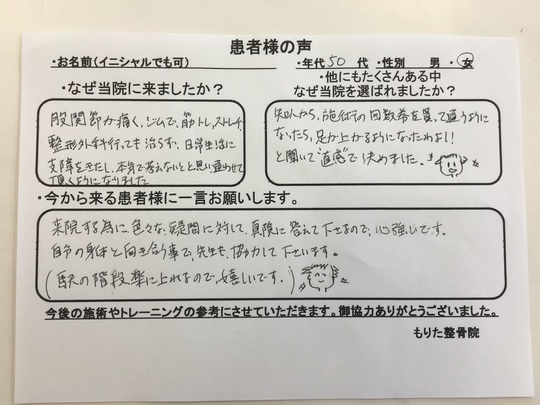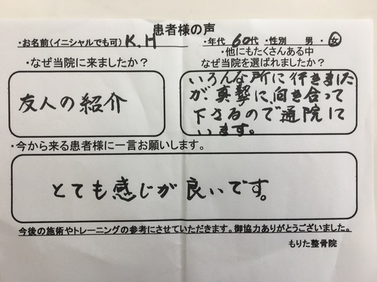 来院するために色々な疑問に対して真剣に答えてくださるので心強いです。自分の身体と向き合うことで先生も協力して下さいます。駅の階段が楽に上がれるので嬉しいです。