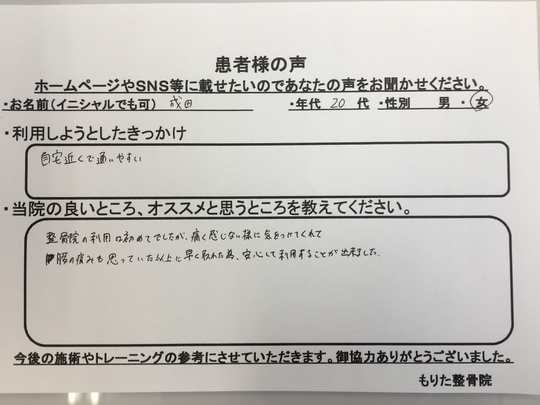 整骨院の利用は初めてでしたが、痛く感じないように気をつけてくれて、腰の痛みも思ってた以上に早く取れた為、安心して利用することができました。