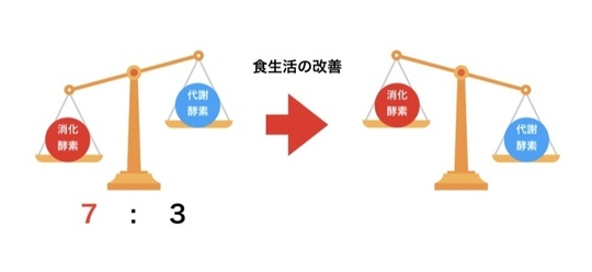 普段は7:3もしくは8:2で消化酵素:代謝酵素が使われています。食べ過ぎたり、消化不良を起こしやすい食事をしていると、人によっては9:1、10:0ということもあります。こうなると、今のあなたの身体は消化酵素を使いすぎて、代謝酵素が不足している可能性が高いです。代謝酵素が足りないとミトコンドリアがエネルギーを作り出せないので、身体は省エネモードで稼働させなくてはなり、代謝が低下します。